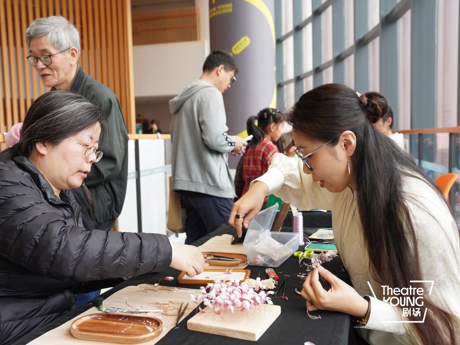 走入剧场内部,氧吧化身“指尖有戏”展览现场,呈现社区居民的手工艺作品;全天30多位手艺人齐聚剧场现场教学,更有不少非遗技法;“麦秆画共创”邀请观众与社区邻里通过剪裁与拼贴,留下属于春天的记忆;“祖孙摄影大赛”特邀资深摄影师王犁指导,以“手艺人”为主题,通过代际协作的方式,让年轻一代用镜头重新发现长辈身上的“隐藏技能”。