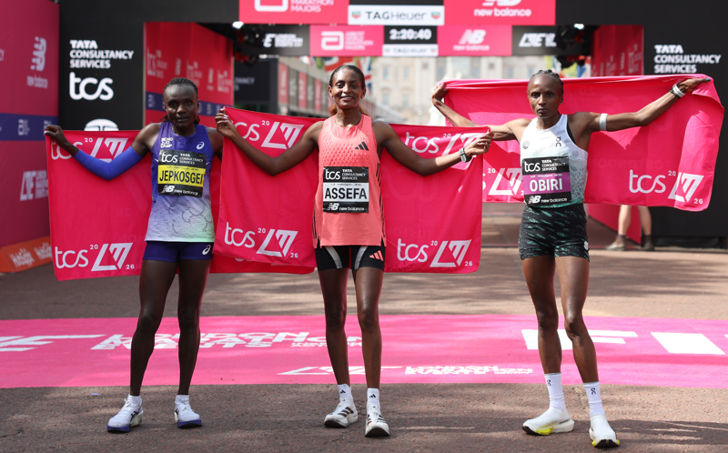 4月26日,冠军埃塞俄比亚选手阿塞法(中)与亚军肯尼亚选手奥比里(右)、季军肯尼亚选手杰普科斯盖在赛后合影。\n 当地时间4月26日,在2026伦敦马拉松女子精英组比赛中,埃塞俄比亚选手阿塞法以2小时15分41秒的成绩成功卫冕,并将自己去年创造的纯女子马拉松世界纪录提升了9秒。\n 新华社记者 李颖 摄