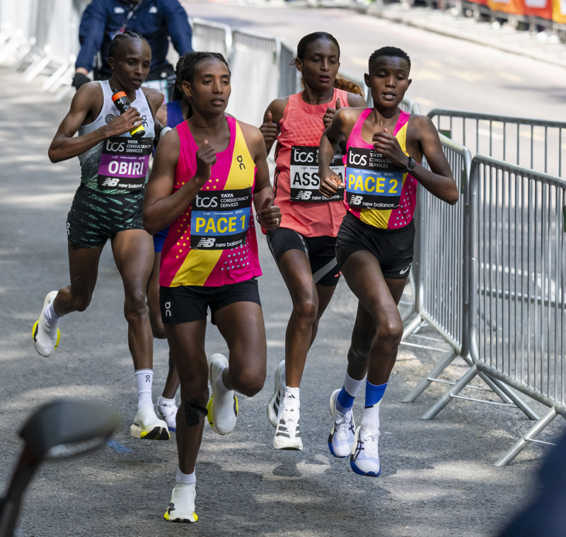 4月26日,埃塞俄比亚选手阿塞法(右二)在比赛中。\n 当地时间4月26日,在2026伦敦马拉松女子精英组比赛中,埃塞俄比亚选手阿塞法以2小时15分41秒的成绩成功卫冕,并将自己去年创造的纯女子马拉松世界纪录提升了9秒。\n 新华社发(史蒂芬·程摄)