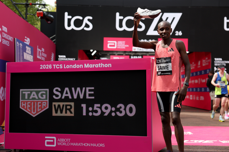 4月26日,萨维在比赛后与记分牌合影。\n 当地时间4月26日,在2026伦敦马拉松男子精英组比赛中,肯尼亚选手塞巴斯蒂安·萨维以1小时59分30秒的成绩打破男子马拉松世界纪录,成为首位跑进全程马拉松两小时大关的运动员。\n 新华社记者 李颖 摄