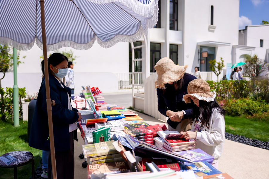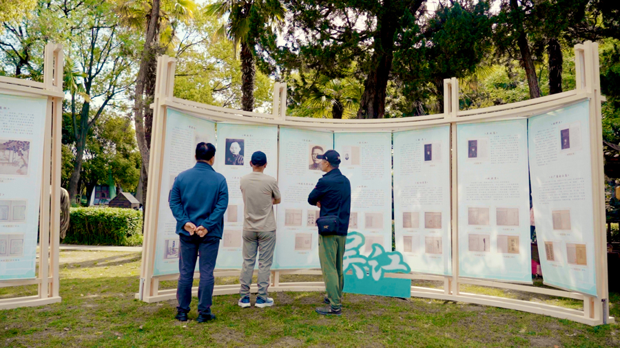 金山百家村和森活艺术中心,金山区全民阅读活动周暨版权宣传周、市民晒书活动在绿意葱茏中接续传统文脉。