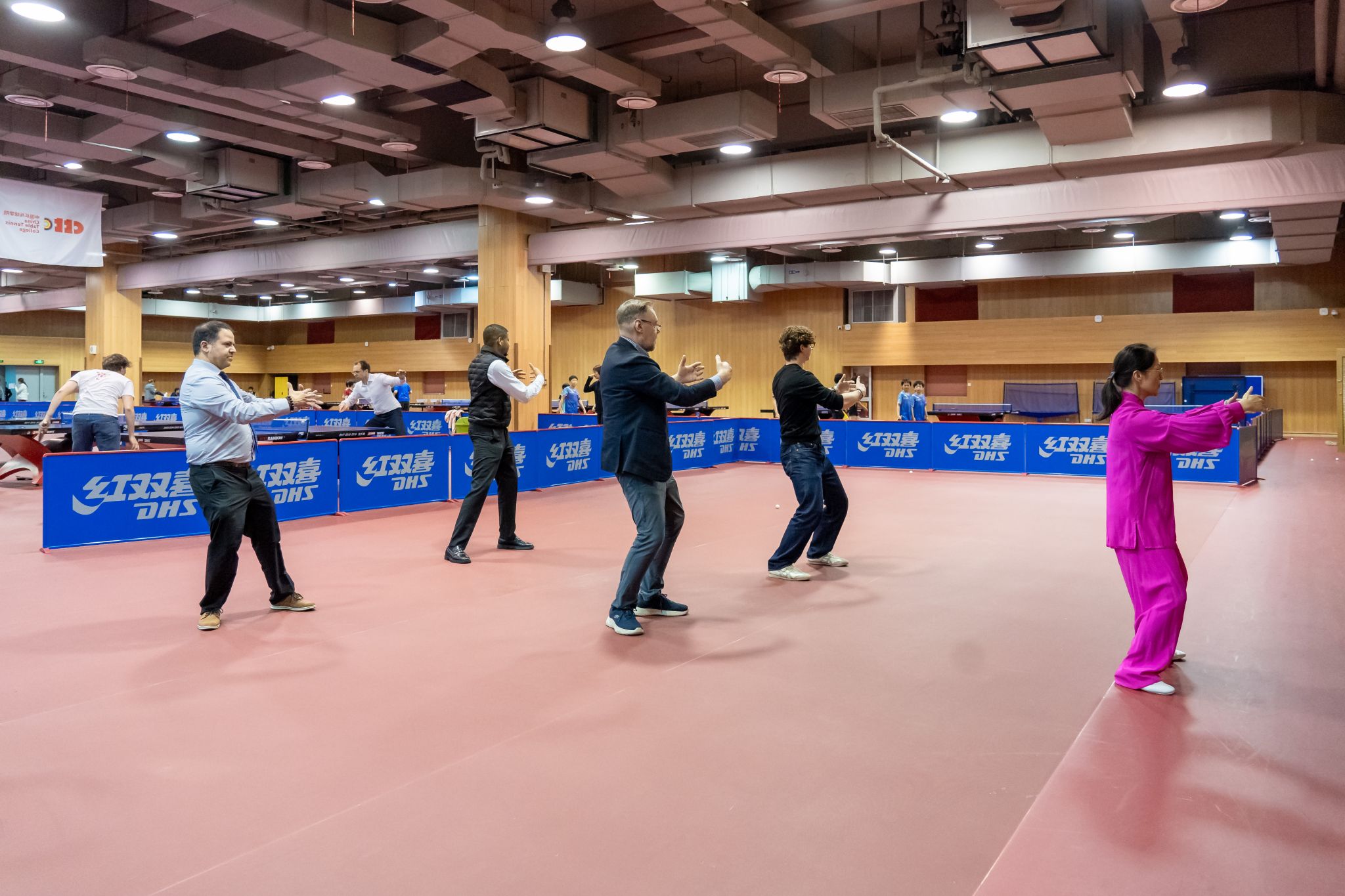 活动现场,上海体育大学精心策划的各类体验环节,成为中外嘉宾互动交流的亮点,也让体育的外交纽带作用愈发凸显。学生带来的跳绳、武术表演精彩纷呈,赢得阵阵掌声;嘉宾们走进中国武术博物馆,在光影与实物中感受中国武术的千年传承;健身气功八段锦的体验环节中,中外嘉宾相互指导、默契配合;乒乓球机器人互动更是点燃全场热情,让大家在轻松愉悦的运动氛围中拉近了距离。